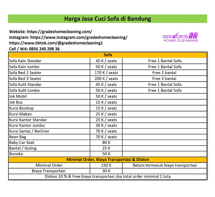 • Apakah biaya transportasi sudah termasuk dalam harga cuci sofa? Tergantung kebijakan penyedia jasa. Grades Home Cleaning seringkali menawarkan promo Gratis Biaya Transport atau mengenakan biaya yang sangat minim untuk area Jakarta Selatan, namun ini perlu dikonfirmasi saat pemesanan.