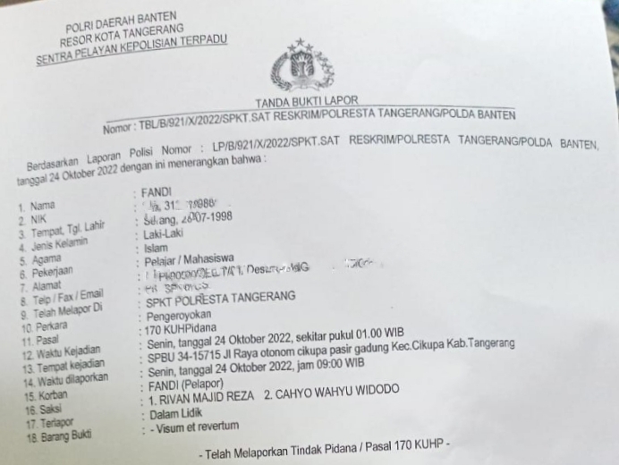 Fandi Ahmad korban pengeroyokan tersebut sudah membuat laporan Kepolisian di Polresta Tangerang dengan tanda bukti lapor Nomor TBL/B/921/X/2022/SPKT.SAT RESKRIM/POLRESTA TANGERANG/POLDA BANTEN, berdasarkan Laporan Polisi Nomor LP/B/921/X/2022/SPKT.SAT RESKRIM/POLRESTA TANGERANG/POLDA BANTEN, tanggal 24 Oktober 2022.