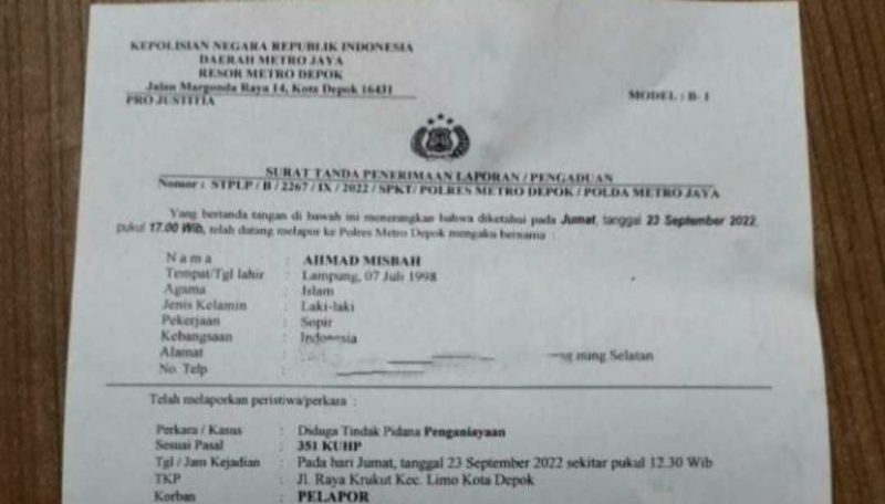 Ahmad Misbah telah melaporan kejadian tersebut yang dialaminya ke Polres Metro Depok dengan nomor : STPLP/B/2267/IX/2022/SPKT/POLRES METRO DEPOK/POLDA METRO JAYA. Korban mendatangi Polres Metro Depok sekitar pukul 17.00 WIB pada Jumat (23/9/2022).